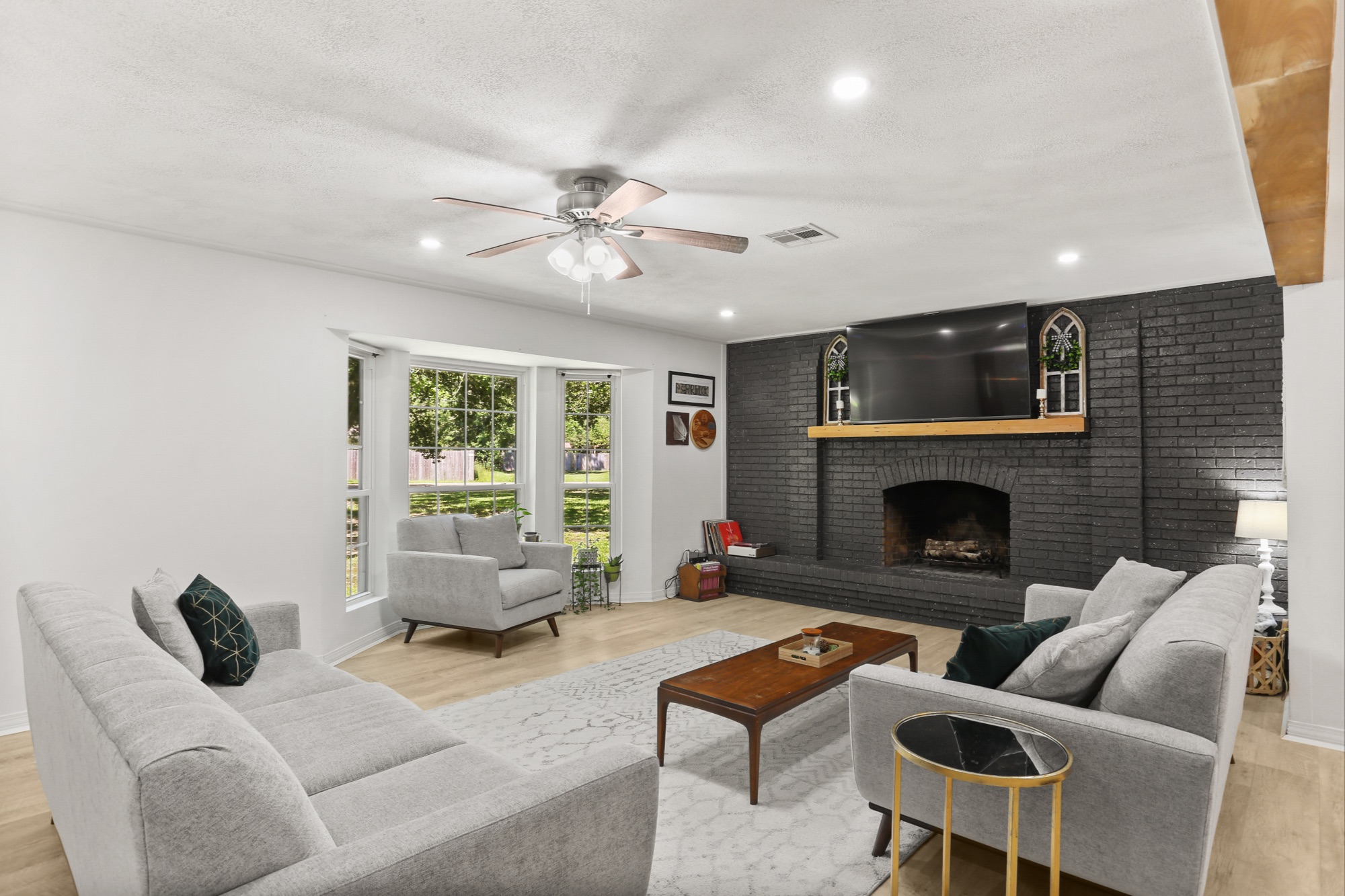 Step inside to find an open floor plan centered around a cozy brick fireplace, creating a warm and inviting living space. The kitchen and living areas flow easily together, while a spacious laundry room and thoughtful layout make daily routines effortless.